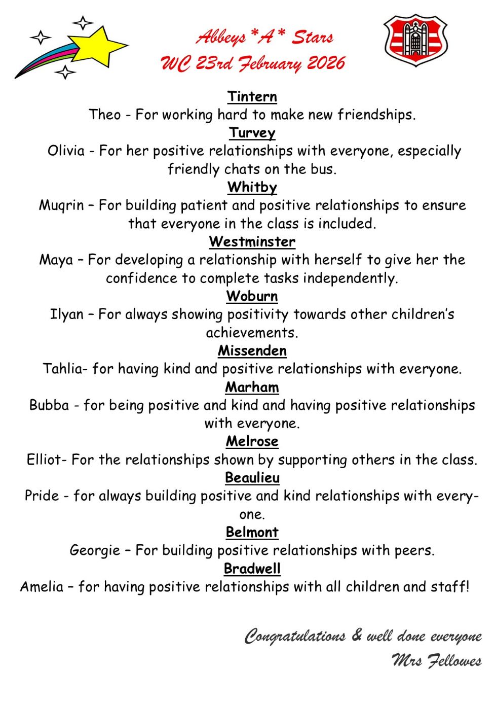 Abbeys Primary School always like to recognise the children's achievements whether they are academic or personal. Each Friday Assembly is our opportunity to share these achievements as a whole school and the children who are 'Abbeys A Stars' that week are rewarded with a book of their choice from the wonderful selection on display. Each week we recognise our 'Star Writers' and their achievements are rewarded with a special 'writers' pencil.
